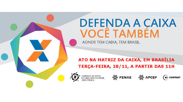 A Confederação Nacional dos Trabalhadores do Ramo Financeiro (Contraf-CUT), a Federação Nacional das Associações de Pessoa da Caixa (Fenae) e demais entidades que compõem o Comitê Nacional em Defesa da Caixa realizarão na terça-feira (28) um ato em frente à matriz da Caixa, em Brasília, para mobilizar os empregados na luta pela manutenção do caráter 100% público do banco. A atividade terá início às 11h.