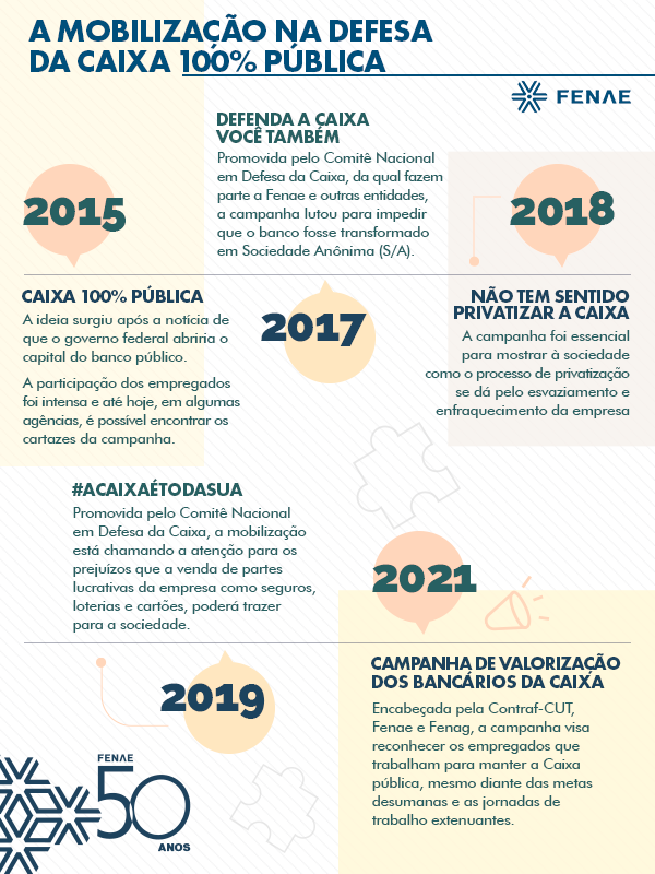 A partir de 2014, os planos de abertura de Capital da Caixa começaram a aparecer e as Campanhas da Fenae, com apoio das entidades representativas e do movimento sindical e associativo, em favor de um banco 100% público aumentaram ainda mais. Confira a linha do tempo: