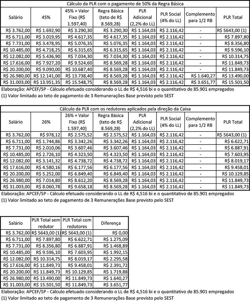 O cálculo da PLR é formado pela Regra Básica da Fenaban (composta por 90% do salário + uma parcela fixa de R$ 3.194,80, limitada ao teto de R$ 17.138,56) somada à parcela adicional Fenaban (de 2,2% do lucro líquido distribuída linearmente entre os empregados) e da PLR Social (que distribui linearmente mais 4% do lucro líquido). Caso esta soma não alcance o valor correspondente à uma Remuneração Base (RB), é previsto o pagamento de uma parcela complementar, para garantir o pagamento mínimo de uma RB. O acordo prevê que o valor anual distribuído de PLR é limitado à 15% do lucro líquido que a Caixa terá no ano de 2023.