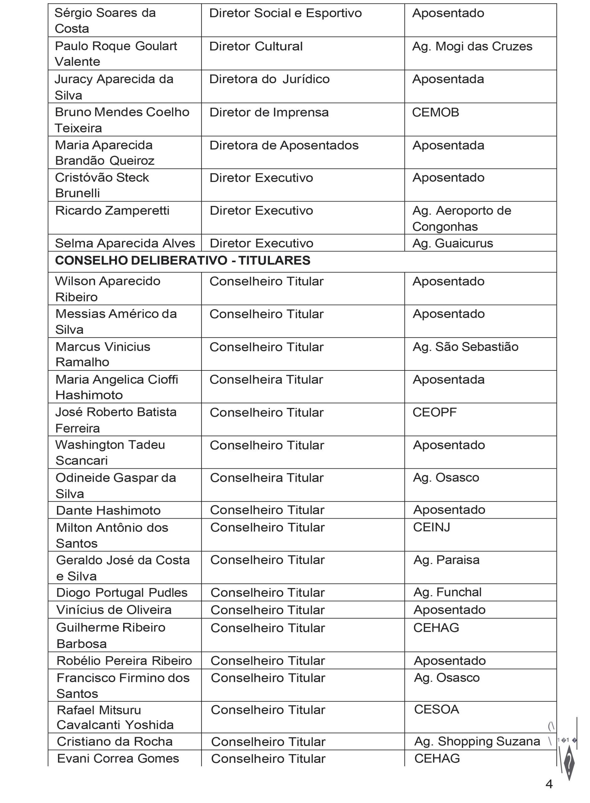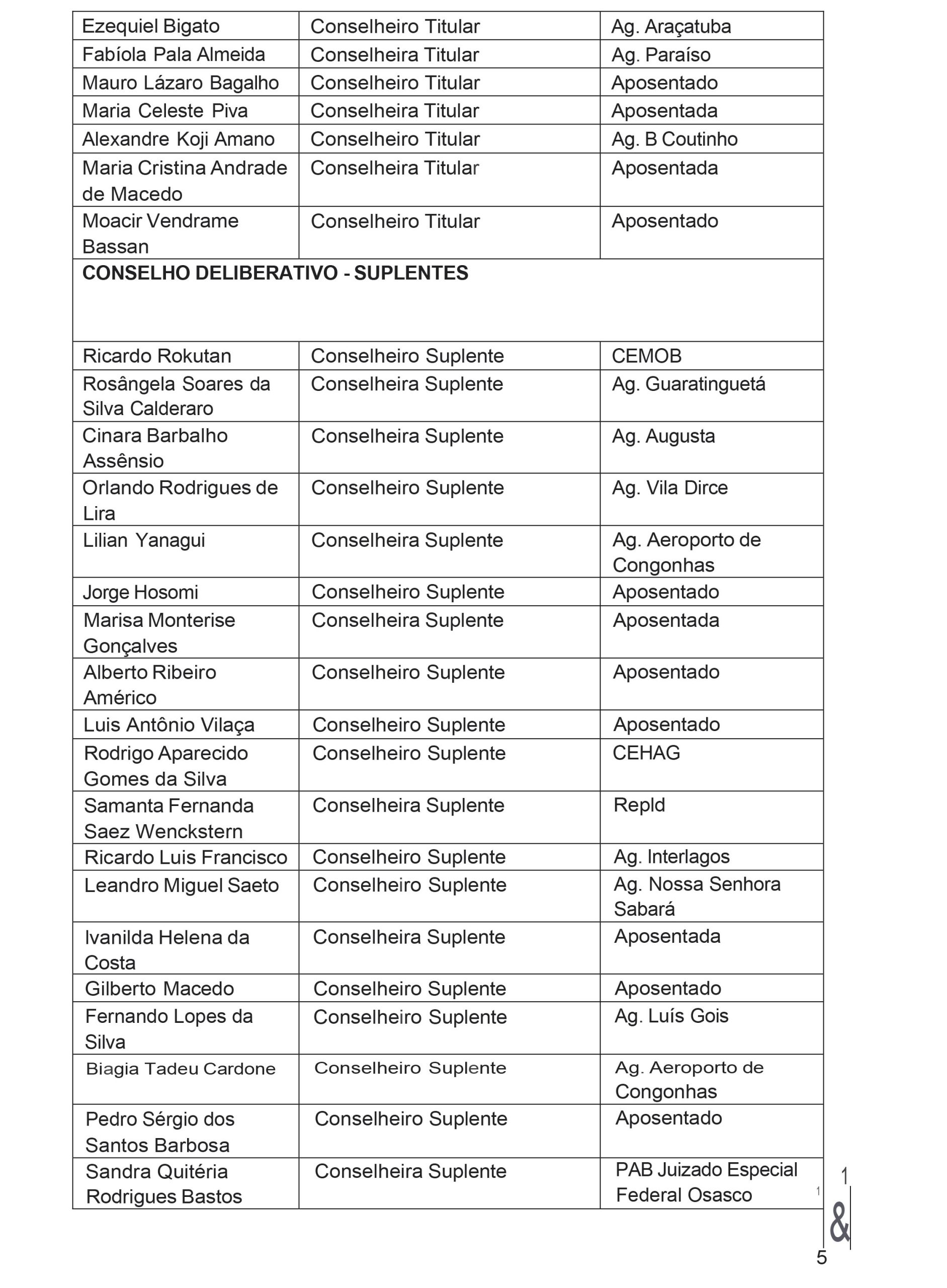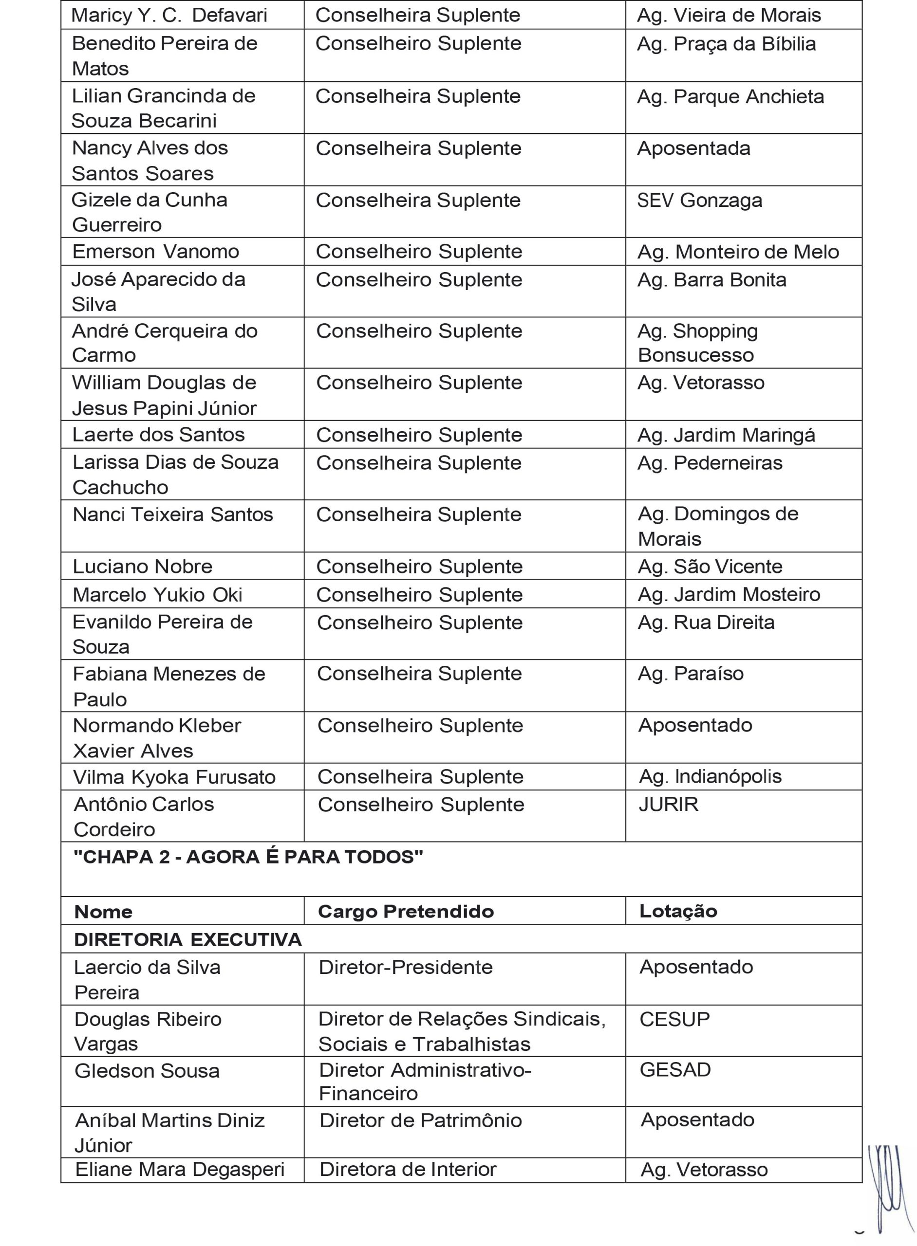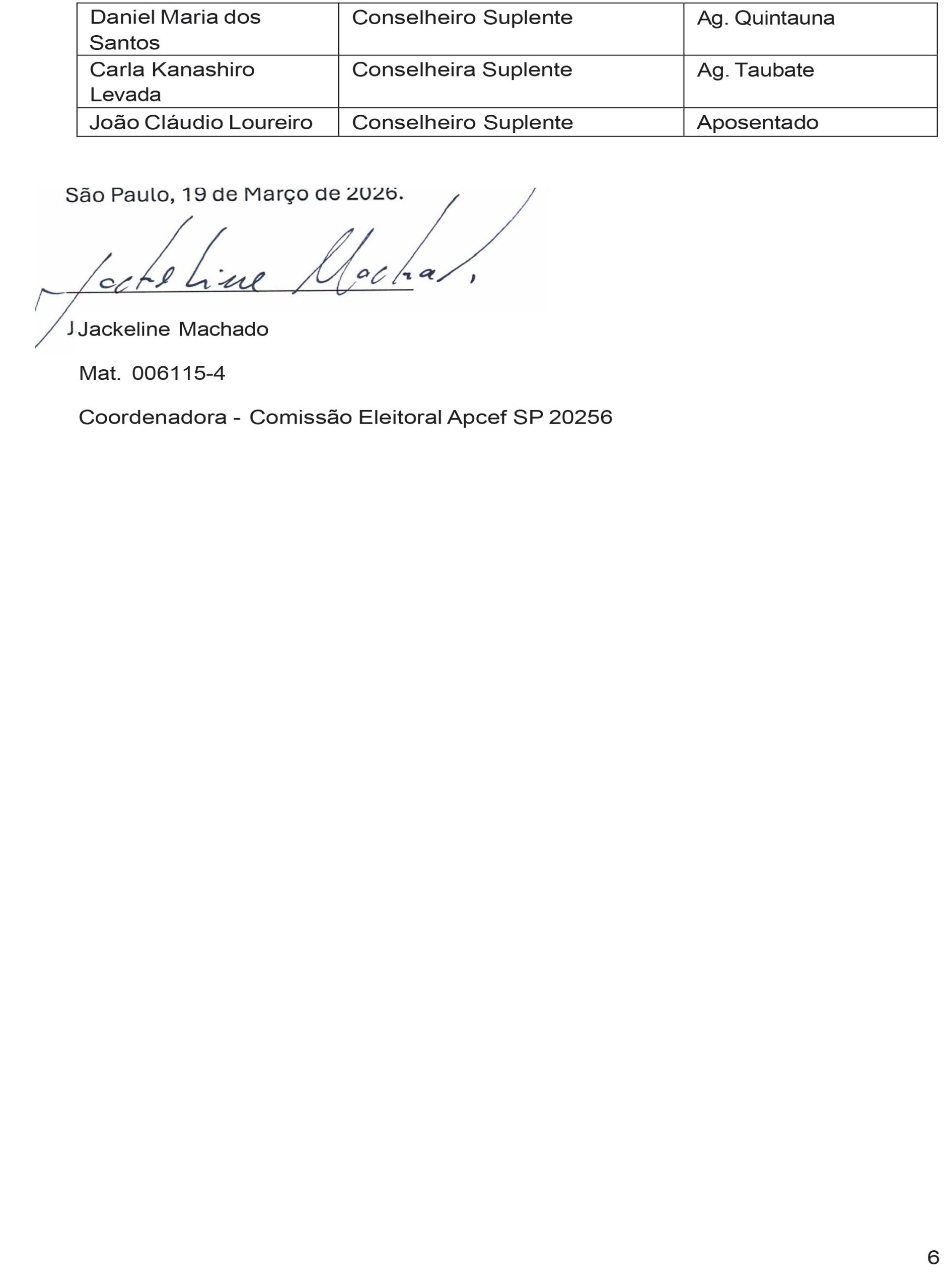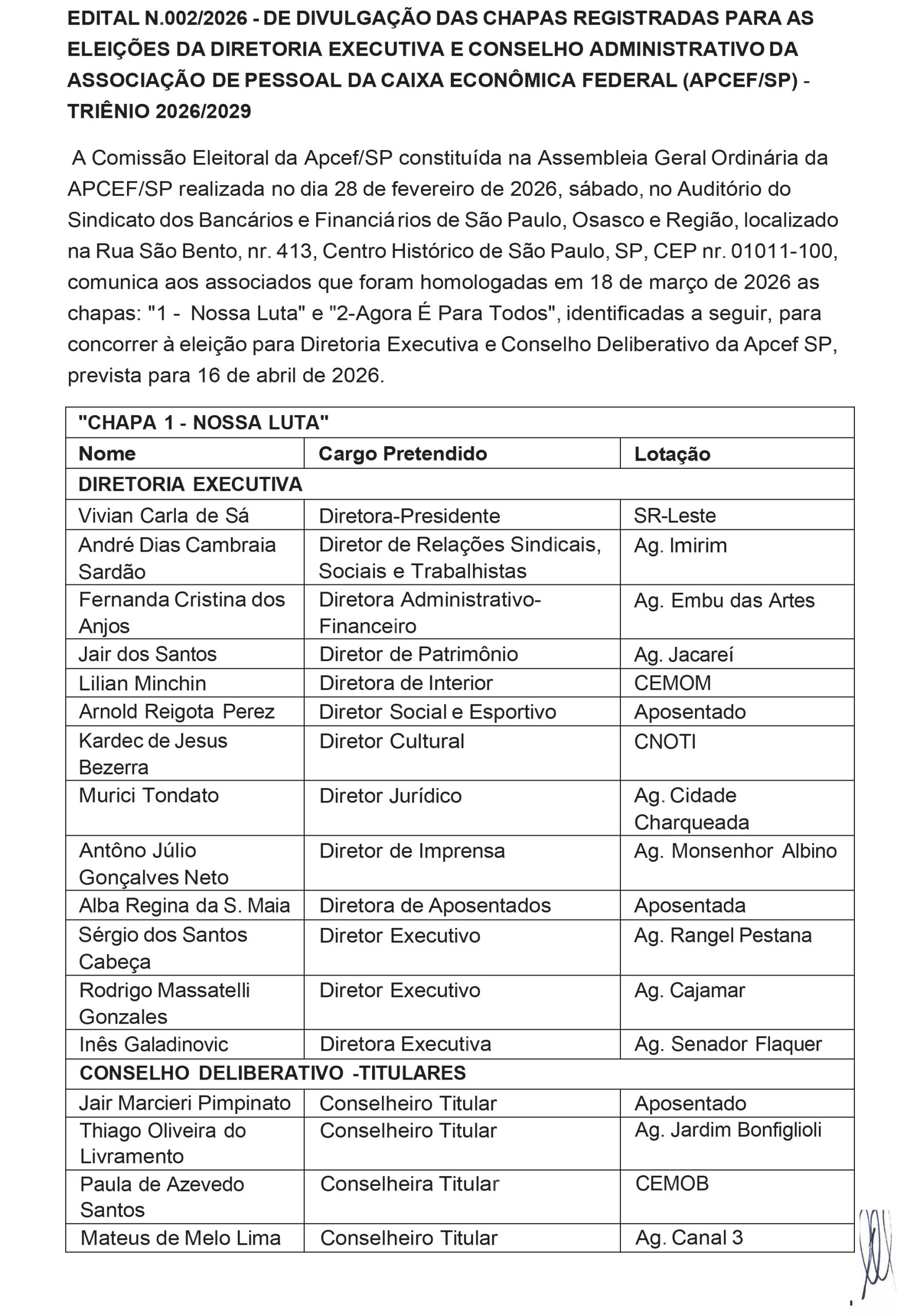A Comissão Eleitoral da Apcef/SP constituída na Assembleia Geral Ordinária da Apcef/SP realizada no dia 28 de fevereiro de 2026, sábado, no Auditório do Sindicato dos Bancários e Financiários de São Paulo, Osasco e Região, localizado na Rua São Bento, n. 413, Centro Histórico de São Paulo, SP, CEP 01011-100, comunica aos associados que foram homologadas em 18 de março de 2026 as chapas: “1 – Nossa Luta” e “2 – Agora É Para Todos”, identificadas a seguir, para concorrer à eleição para Diretoria Executiva e Conselho Deliberativo da Apcef/SP, prevista para 16 de abril de 2026.