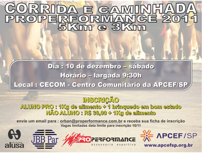 Para os amantes das competições de corridas e de caminhadas, a APCEF em parceria com a Properformance está programando a Corrida Properformance 2011, para o dia 10 de dezembro, sábado, às 9h30, no clube da APCEF, à Avenida Yervant Kissajikian, 1.256, Interlagos, capital.