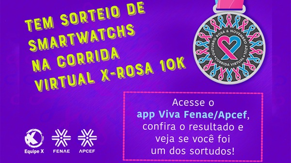 Além de Regina, o ganhador do outro relógio, de modelo masculino, foi o associado da Apcef Mato Grosso do Sul Márcio Reis Valério. O sorteio foi realizado entre os atletas inscritos no aplicativo Strava, que responderam ao quiz do Viva Fenae/Apcef e cumpriram o desafio, ao postarem no dia da corrida pelas redes sociais a hastag Viva Fenae Apcefs Corrida Virtual X Rosa.