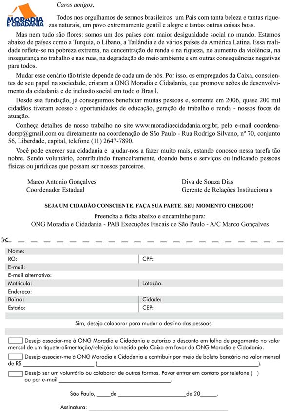 Leia, abaixo, uma carta da ONG Moradia e Cidadania para você (para colaborar, imprima a ficha, preencha e siga as orientações para envio):