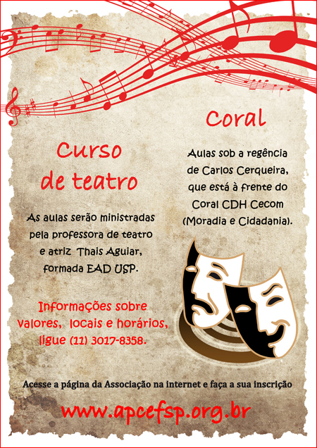 Na capital, os grupos de coral e de teatro se reunirão aos sábados, no Centro Comunitário da APCEF/SP, na Avenida Yervant Kissajikian, 1.256, em Interlagos.
