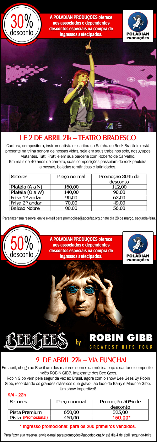 A APCEF/SP realizará sorteios de ingressos para o show de Rita Lee e do tributo aos Bee Gees (com Robin Gibb), entre os associados que se inscreverem. Trata-se de uma parceria com a Poladian Produções, em comemoração do aniversário de 104 anos da Associação, a serem completados em 2 de abril.