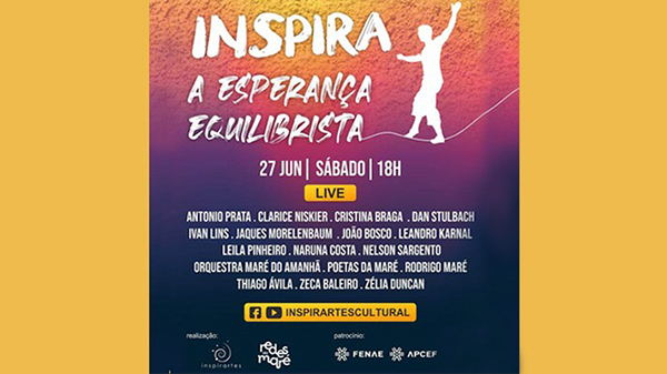 Com o patrocínio da Fenae e das Apcefs, a Inspirartes Cultural e Redes da Maré realizam no próximo dia 27 de junho (sábado), a partir das 18 horas, o evento “Inspira: a Esperança Equilibrista”, uma live-filme repleta de sonho, esperança e de arte. Todos os empregados da Caixa Econômica Federal estão convidados a participar desse movimento, mesmo que de dentro de casa.