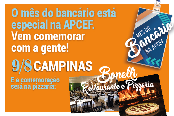 A Apcef/SP está preparando eventos em todo o Estado, em agosto, para comemorar o mês dos bancários. Dia 9, terça-feira, a partir das 19 horas, será a vez de comemorar com os empregados da região de Campinas, no Bonelli Restaurante e Pizzaria, inscreva-se agora mesmo!