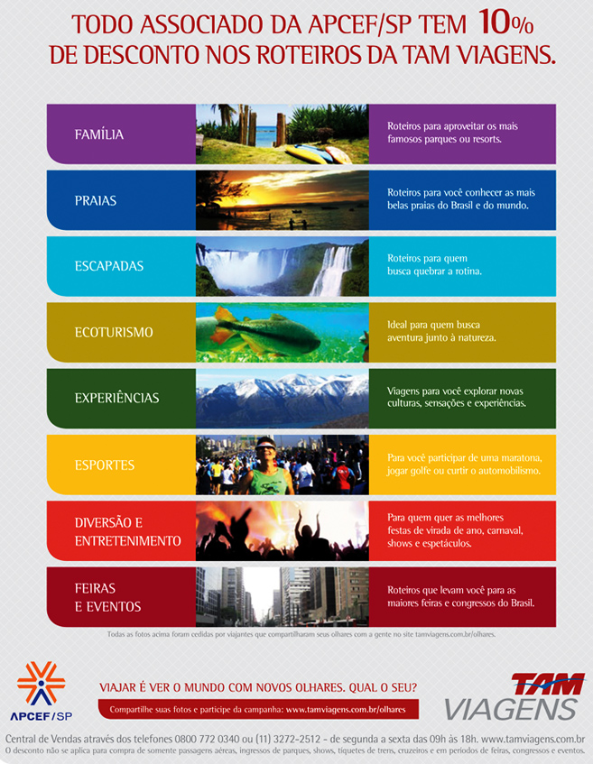 Página Todo associado da APCEF tem 10% de desconto nos roteiros da TAM Viagens | APCEF/SP