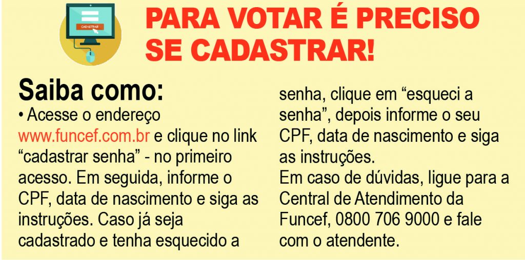 A votação acontece no Portal ou no aplicativo da Fundação. Fique atento: não haverá votação pelo sistema interno da Caixa (SISRH) nem por telefone. Por isso, é preciso cadastrar-se para ter acesso à plataforma nos dias da votação (veja quadro abaixo).