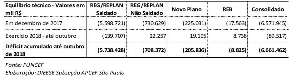 Tabela – Equilíbrio técnico dos planos administrados pela FUNCEF – déficit até outubro de 2018