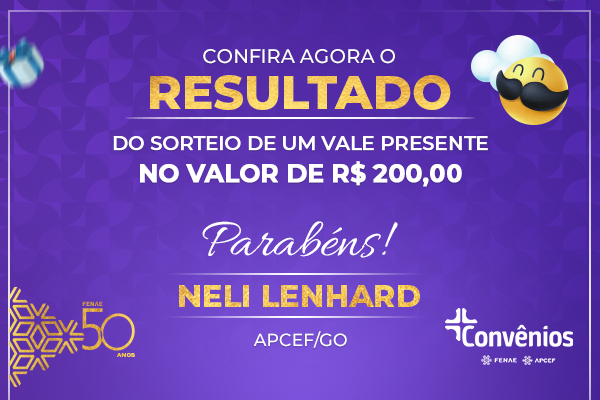 A feliz ganhadora do sorteio da promoção do Mês dos Pais na plataforma de Convênio da Fenae e das Apcefs, que foi realizado nesta terça-feira, dia 31, foi a associada Neli Lenhard, da Apcef de Goiás. Neste mês o sorteio especial foi de um vale presente de R$ 200, ideal para o Mês dos Pais.
