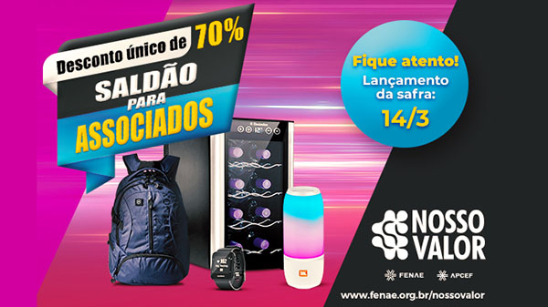 Começa no próximo sábado (14) a 20ª Safra do Nosso Valor Saldão, exclusiva para associados das 27 Apcefs. Está é a primeira safra de 2020 e na lista de produtos disponíveis estão caixa de som JBL, relógios Garmin, mochila Victorinox e adegas de vinho. Gostou? Fique atento! As compras no catálogo de prêmios serão abertas a partir das 10h e poderão ser feitas até o dia 17 de abril, até às 23h59 ou enquanto durarem os estoques.