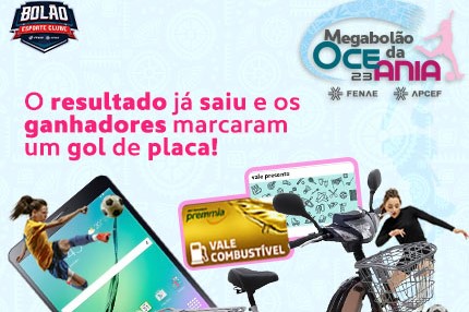 Saiu o resultado do sorteio do Megabolão da Oceania, encerrado no último dia 20 de agosto. Os três primeiros colocados foram: Sérgio Henrique Loss Carvalhosa (Apcef/ES), Luciano Massaaki Kamano (Apcef/SP) e Benedito de Freitas Neto (Apcef/MG), nesta ordem.