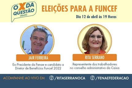 As eleições da Fundação dos Economiários Federais (Funcef) 2022 estão chegando. Para falar sobre o assunto e os desafios da Fundação, o diretor de Formação da Federação Nacional das Associações do Pessoal da Caixa Econômica Federal (Fenae), Jair Pedro Ferreira, vai bater um papo com a conselheira de Administração da Caixa (CA/Caixa), Rita Serrano, nesta terça-feira (12), às 19h. A transmissão será pelos canais da conselheira, com retransmissão pelo Facebook da Fenae.