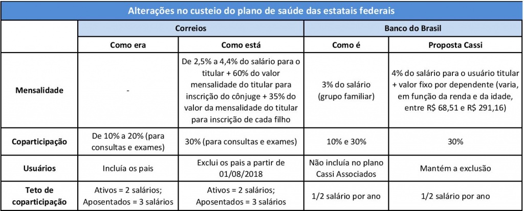 Hoje, ativos e aposentados do BB contribuem com 3% de sua folha de pagamento como mensalidade para o grupo familiar, além de coparticipação, de 10% ou 30%, de acordo com o procedimento realizado, e o banco contribui com 4,5% no financiamento da Caixa de Assistência dos Funcionários do Banco do Brasil (Cassi), responsável pelo programa de assistência à saúde dos funcionários. Com publicação das resoluções da CGPAR e do Ofício Circular 146/2018 do Ministério do Planejamento, o banco apresentou uma proposta de mudança no estatuto da Cassi para adequá-la às resoluções, que prevê alterar o financiamento do plano, mantendo a contribuição do banco em 4,5% da folha, aumentando a mensalidade do titular para 4% do salário e cobrando por dependente inscrito uma mensalidade que varia entre R$ 68,51 e R$ 291,16, conforme a condição (ativo ou aposentado) e renda, além do aumento da coparticipação, para 30% .