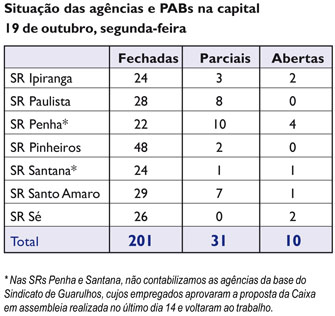 Nesta segunda-feira, dia 19, a greve dos bancários da Caixa permanece forte em todo o País. Das Superintendências Regionais da capital, consultadas diariamente pela APCEF/SP, 232 agências estão fechadas ou funcionando parcialmente.