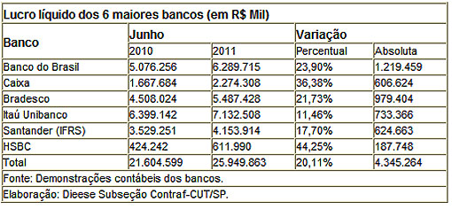Os seis maiores bancos que operam no Brasil lucraram R$ 25,9 bilhões no primeiro semestre de 2011, de acordo com levantamento da Subseção Dieese da Contraf-CUT. Esse ganho estrondoso significa um aumento de R$ 4,3 bilhões em relação ao mesmo período do ano passado, um crescimento médio de 20,11%.