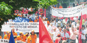 Os trabalhadores voltaram às ruas para reivindicar a renovação do acordo de correção da tabela do Imposto de Renda (IR), o aumento do salário mínimo para R$ 580 e o reajuste das aposentadorias e pensões.