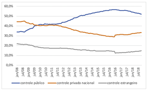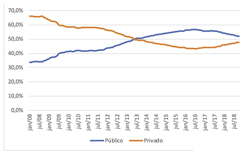 Em 2009, as operações de créditos dos bancos públicos superaram as dos bancos privados nacionais. Em 2013, elas superaram a soma das operações dos bancos privados nacionais e internacionais. Mas, em 2016, a curva do crescimento começa a cair, como pode-se observar no gráfico abaixo: