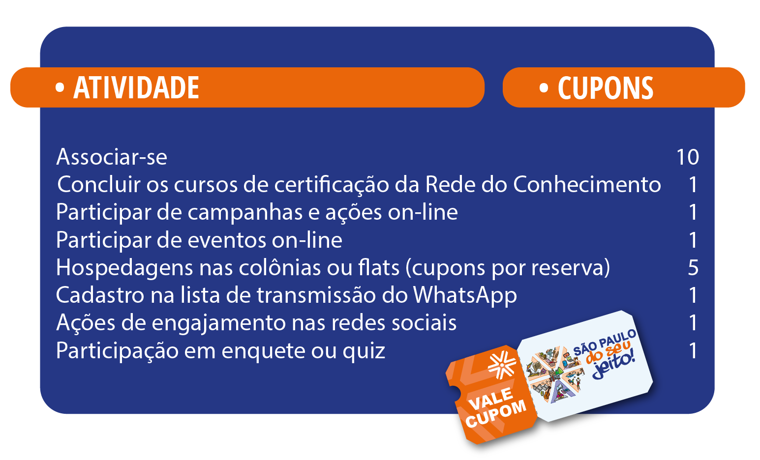 E, quem já é associado, acumula cupons eletrônicos durante todo o ano e concorre a muitos prêmios. Confira, abaixo, as ações que valem cupons e os prêmios que serão sorteados: