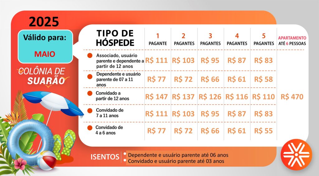 Confira as tabelas de preços de maio (valor da diária, por pessoa), exceto pacotes especiais: