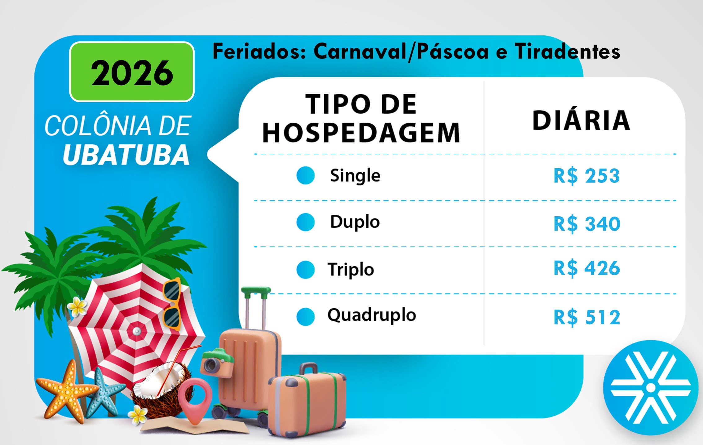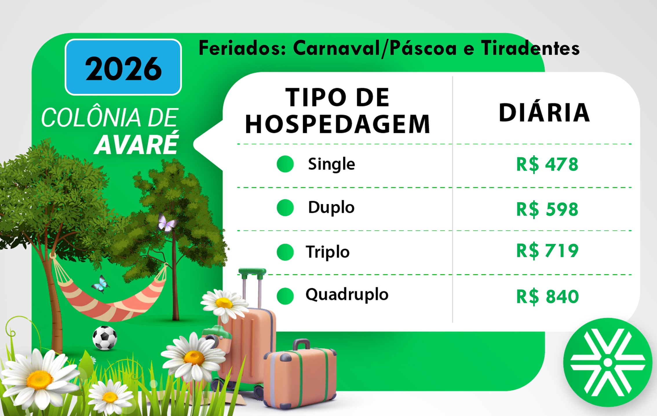 – Diária de convidado: R$ 55 por pessoa com mais de 7 anos de idade.