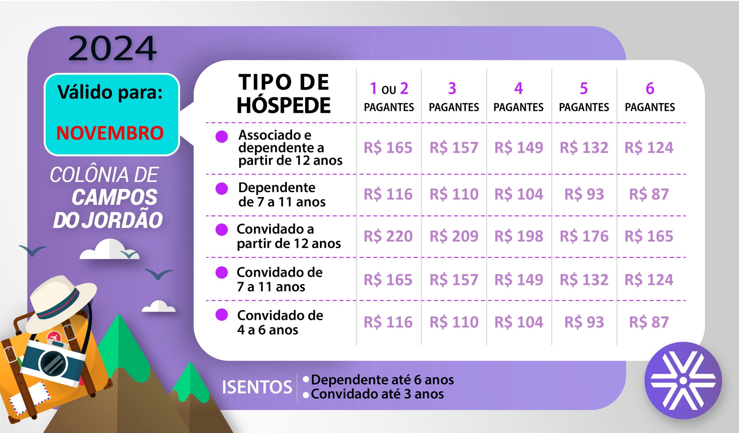 Confira as tabelas de preços de novembro (valor da diária por pessoa), exceto pacotes especiais: